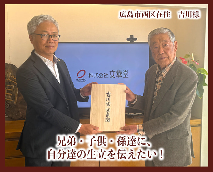家系図の校正を提出させていただき、お客様に確認していただきます。家系図をご覧いただきながら、聞き取り調査を行ったり、掲載したい写真などをお預かりさせていただきます。